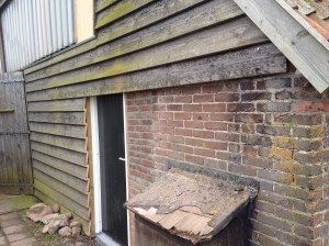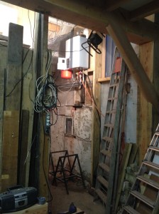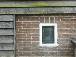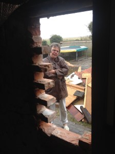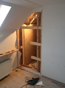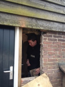 Links de oude deur die er ooit zat is later dichtgetimmerd. Voor die nieuwe deur moesten we eerst een stuk muur wegzagen en het gat, waar het raampje zat en dat overblijft, netjes opvullen. Corna ziet dat het goed is; ‘poppetje gezien kastje dicht’.