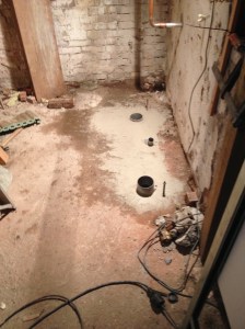 Gat graven en vullen met 300 kg beton. De betonnen poer staat klaar om er boven op te monteren. Daarboven op komt dan de staander, tegen de muur.