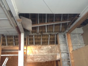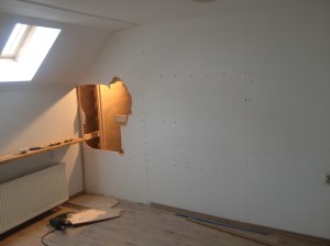 Balken monteren. Zware vloerplaten met isolatie optakelen. Gipsplaten verven en optakelen en neerleggen bovenop de balken.