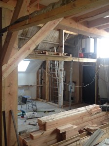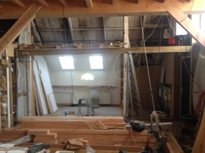De laatste twee balken voor het derde juk. De korte staat inmiddels tijdelijk ‘geparkeerd’ tegen de zolder voor hij naar z’n eigen plek, aan de overkant, kan. De lange (zes meter, 400 kilo) komt op drie meter hoog tussen de twee staanders. Samen vormen de drie een ‘juk’. tussen de jukken komen balken en daarop komt de rest van de zoldervloer.