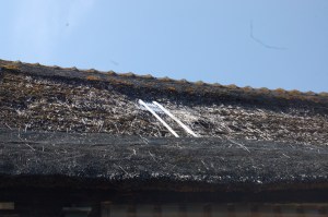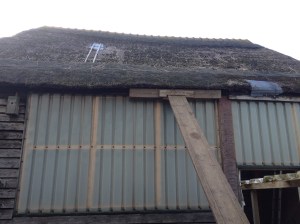 Het grootste gat in het dak is nu zo groot geworden, dat het tijd werd voor actie. Het riet ter plekke is eigenlijk een soort compost met stukjes riet geworden; het viel gewoon naar binnen. Het leek ons het beste om het gat aan de buitenkant af te dekken met een stevig dekzeil (2×3 meter PVC). Gisteren besteld en vandaag gemonteerd door Cees en Ryan. Precies op tijd om te worden gefilmd door Roel en Lucas die vandaag aan het filmen waren in het kader van onze komende ‘sluit het dak’ actie; waarover meer nieuws volgt.