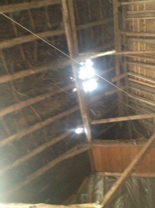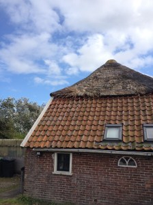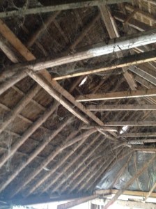 Het dak is slecht en aan vervanging toe. Al het riet en al de pannen moeten er af. Ook de sporenkap (het hout waar het riet op rust) moet vervangen worden. We hebben de middelen echter niet om het nu aan te pakken. Daarom hebben we een aanvraag gedaan voor een renteloze lening bij ‘Alle hens aan dak’. Onze aanvraag is in behandeling.