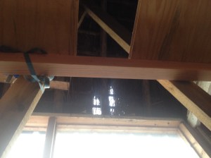 Even de rest van het laatste oude juk slopen. Handig die verplaatsbare steiger die we van Arie mogen lenen. Helaas passen de wielen er niet onder; dan wordt hij te hoog.