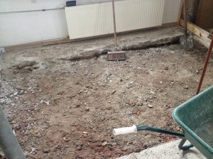 Dan gaat ook de slaapkamer er aan. Hier komt de wand tussen het halletje en het atelier. En het tweede juk kan er uit. Onverwacht ligt in de slaapkamer een extra betonvloer 10 m2 van 12 cm dik.