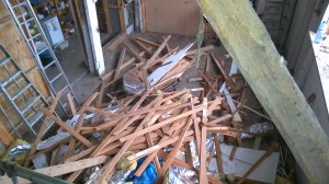 Dan alle dakspanten boven de nieuwe balk doorzagen. Het dak ‘hang’ even. Nu kan de oude balk in stukken weg worden gezaagd. Resultaat héél véél stof, veel brandhout en een héél breed, groot gat onder het riet.