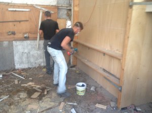 Tijd om het oude schot en de laatste twee oude staanders er uit te slopen. Karin maakt vast een gedetailleerde tekening voor het nieuwe schot. Sloop geeft weer een hoop rotzooi; maar het is wel leuk!!! De oostkant van het huis is nu bijna helemaal open over een breedte van tien meter, tot vier meter hoog. Wat een licht komt er nu binnen en veel frisse lucht. Corna maakt weer mooie foto’s.