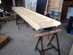 De derde bovenbalk (400kg) omhoog hijsen) Dan is het derde en laatste juk klaar. Daarna de zolderbalken er tussen.